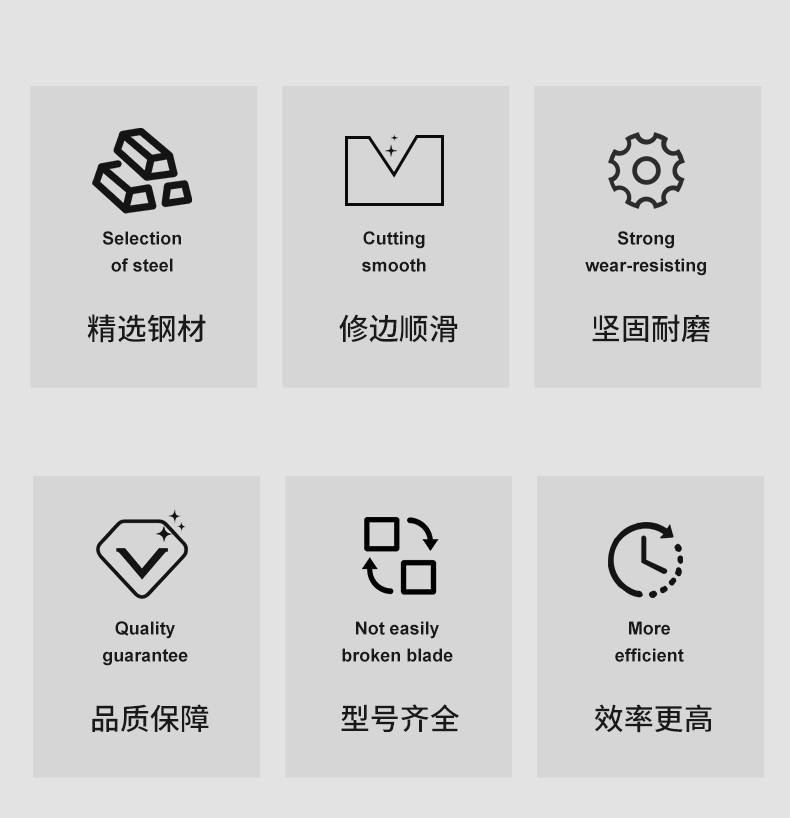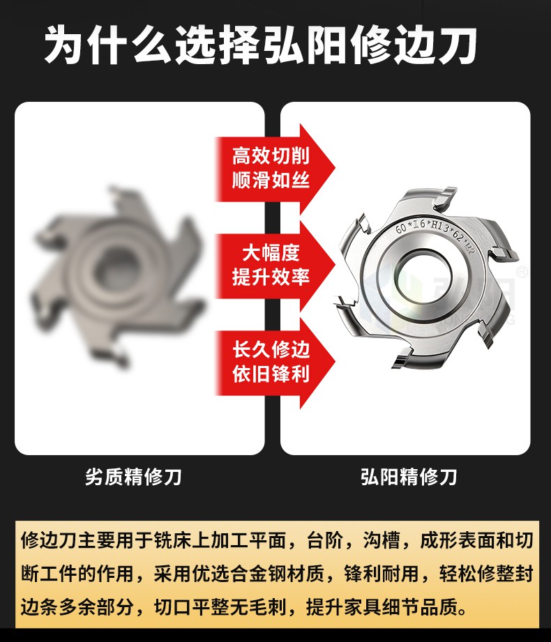 修边刀主要用于铣床上加工平面,台阶,沟槽,成形表面和切断工件的作用,采用优选合金钢材质,锋利耐用,轻松修整封边条多余部分,切口平整无毛刺,提升家具细节品质。
