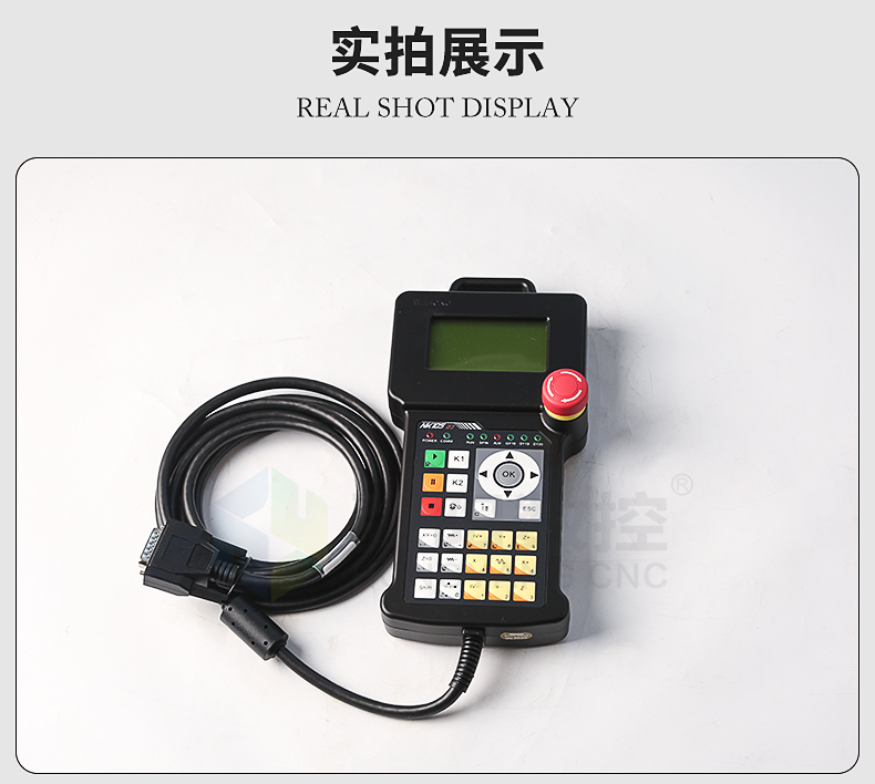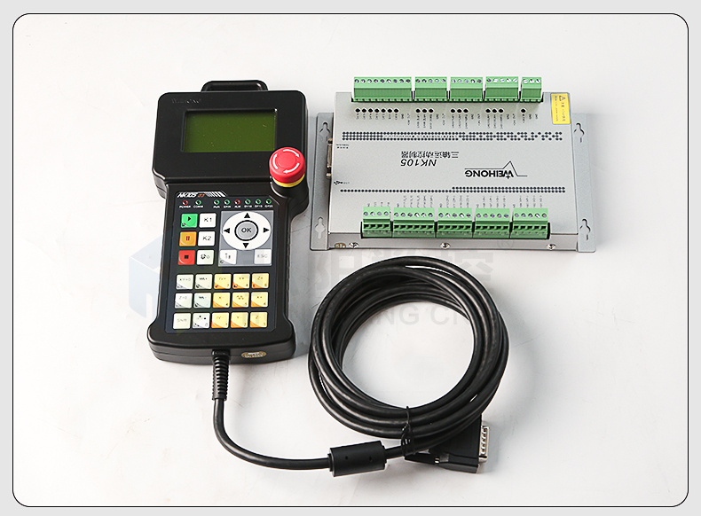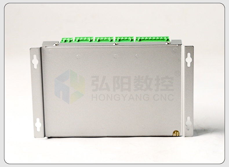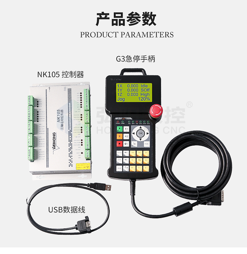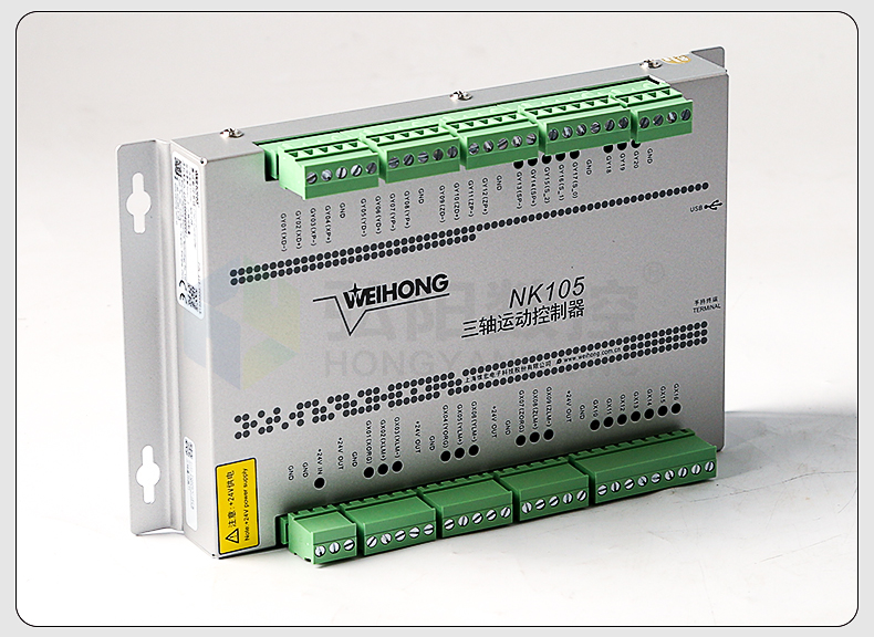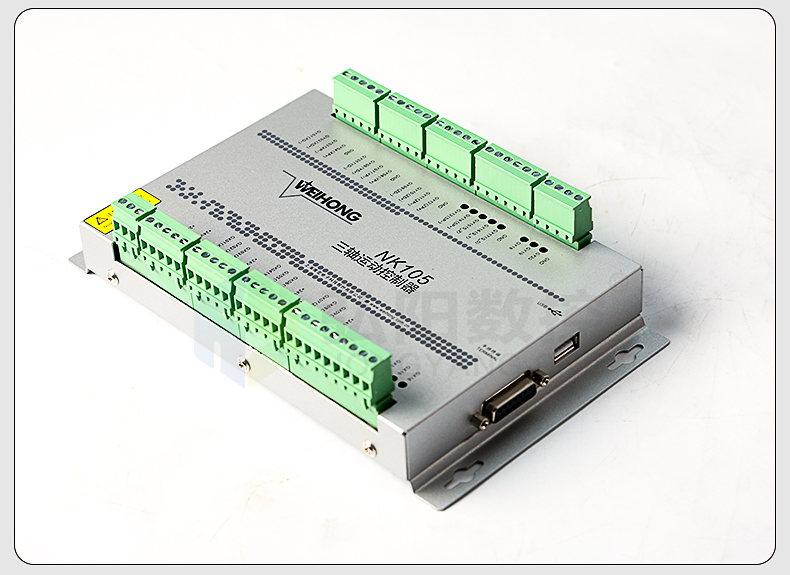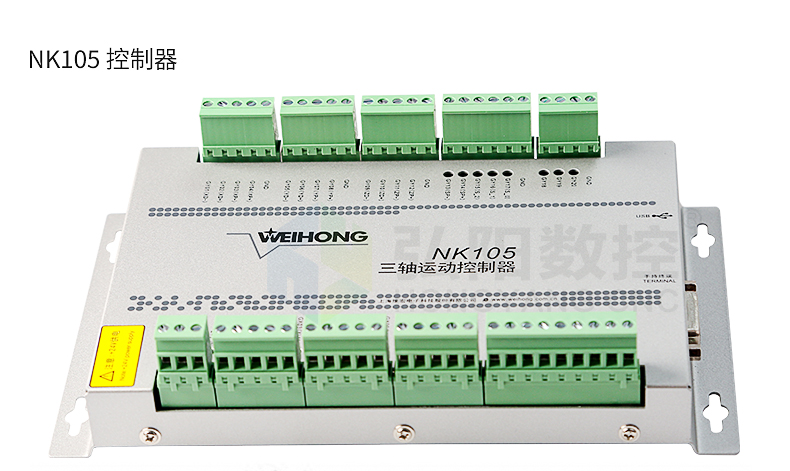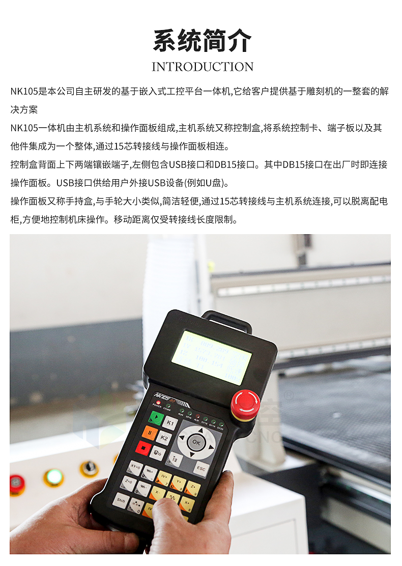 NK105 一体机由主机系统和操作面板组成,主机系统又称控制盒,将系统控制卡、端子板以及其他部件集成为一个整体,通过15芯转接线与操作面板相连。控制盒背面上下两端镶嵌端子,左侧包含USB接口和DB15