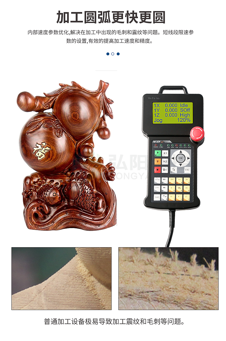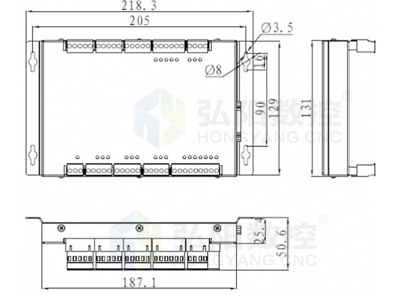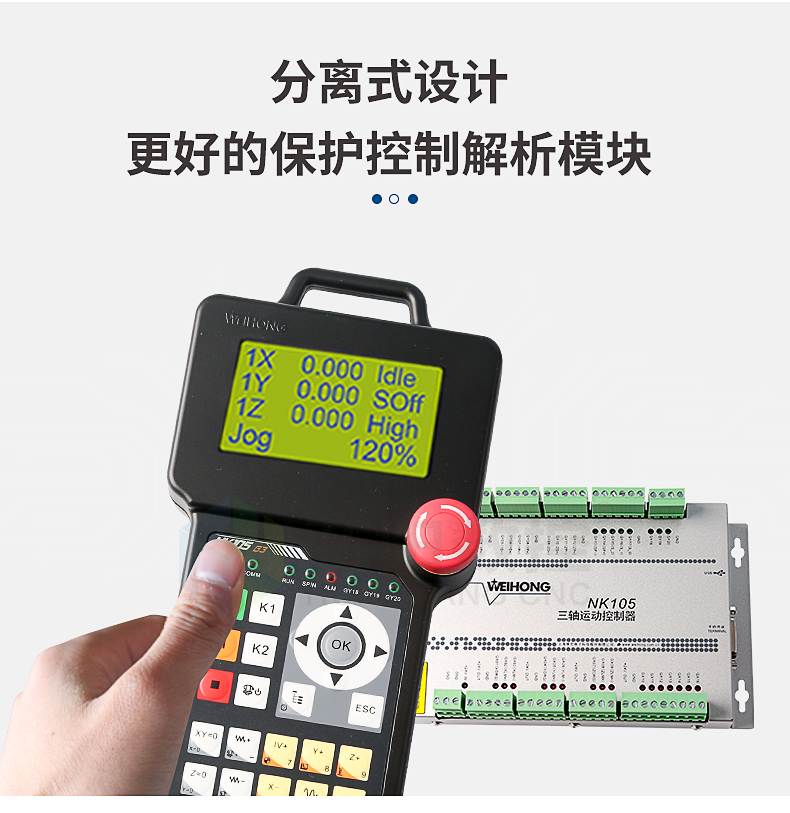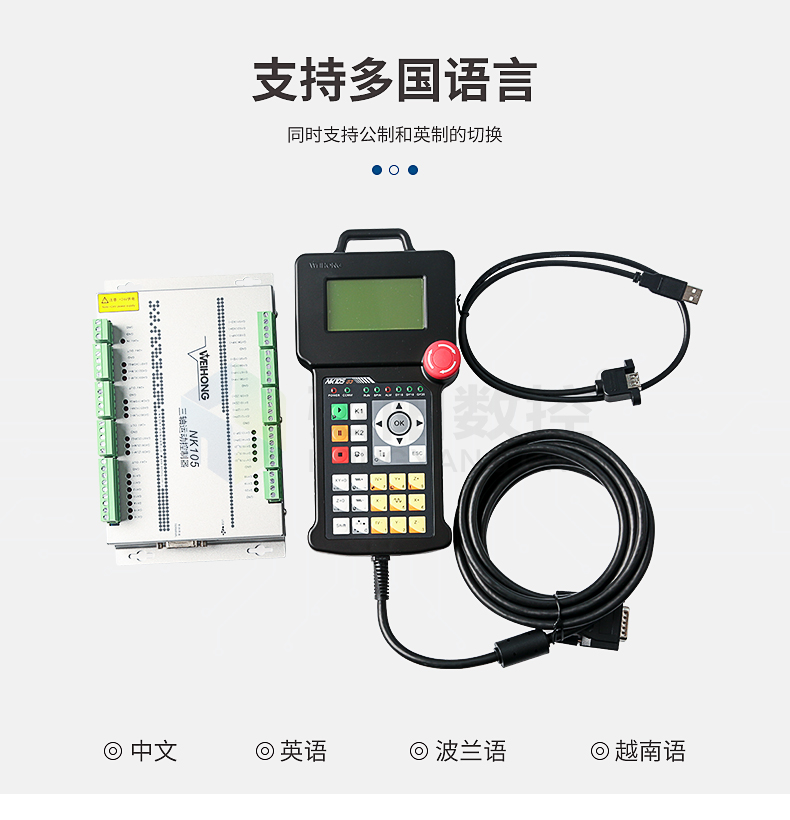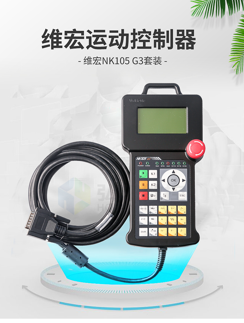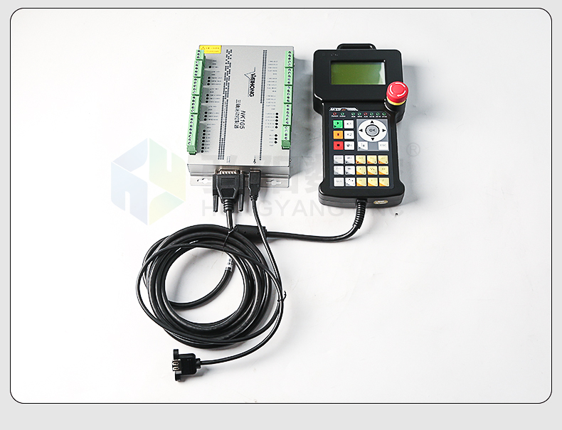 NK105 一体机由主机系统和操作面板组成,主机系统又称控制盒,将系统控制卡、端子板以及其他部件集成为一个整体,通过15芯转接线与操作面板相连。控制盒背面上下两端镶嵌端子,左侧包含USB接口和DB15