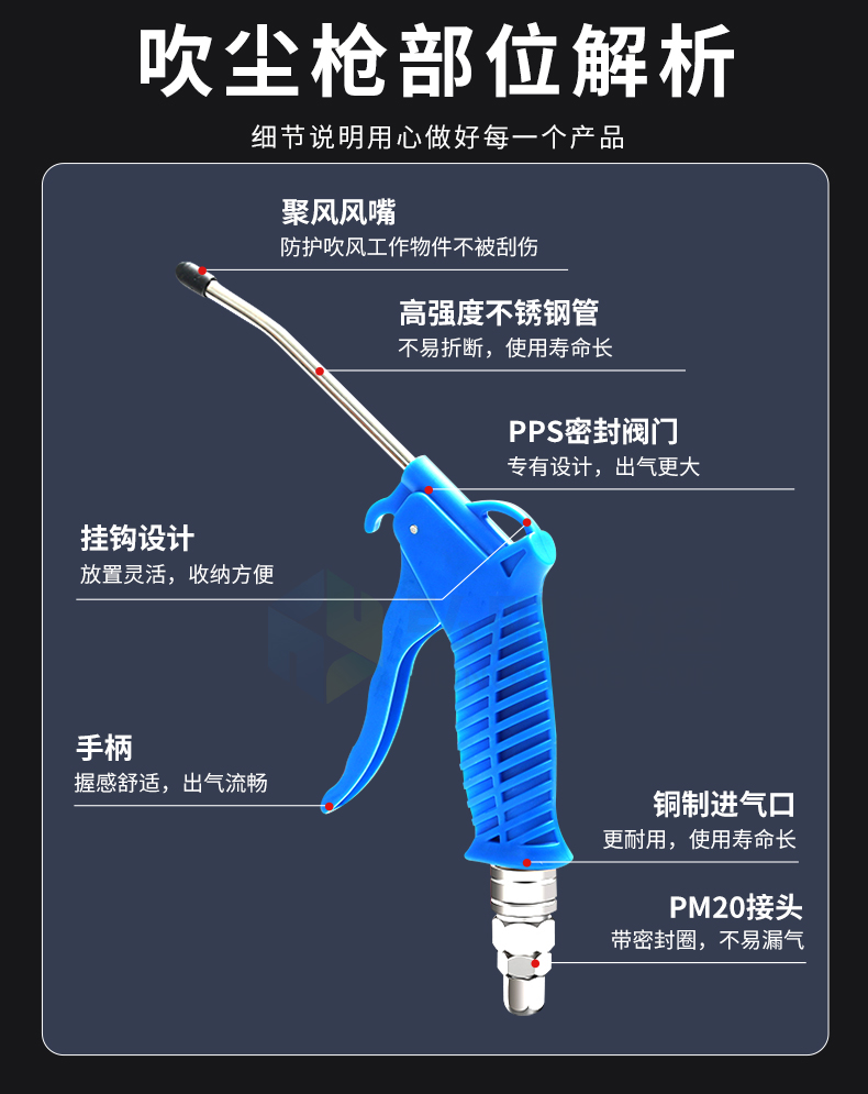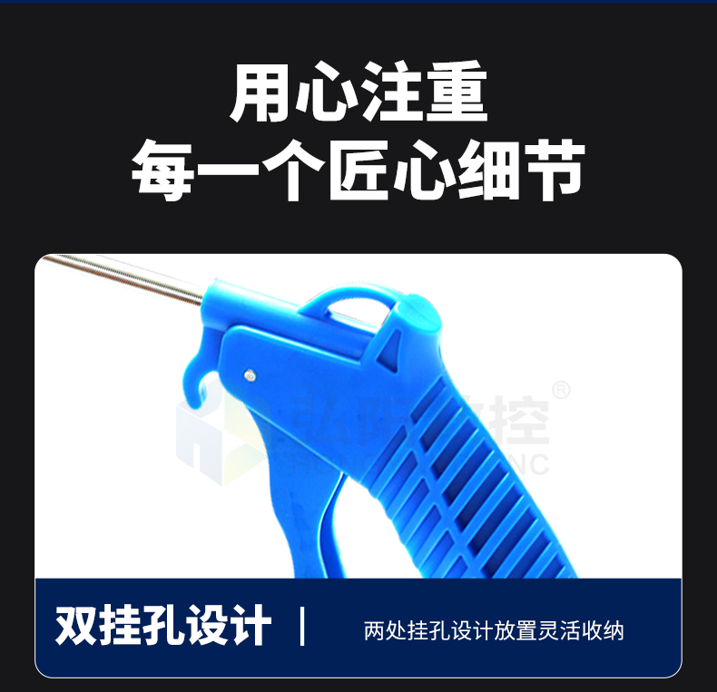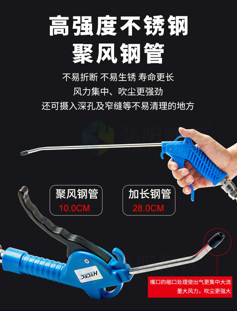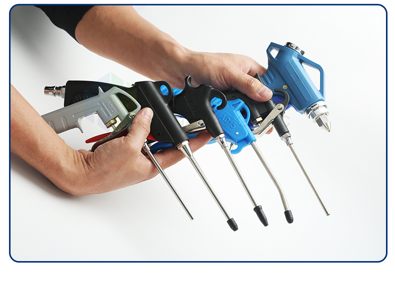 吹尘枪是一种以压缩空气为动力,用于吹除尘屑的手持式清理工具。气动吹尘枪是利用空气放大的原理,有效减少压缩空气的消耗量,从而产生强大和精确的气流,并带动周围空气一起工作。